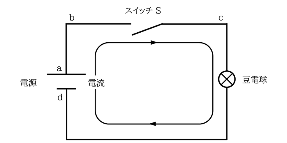 スイッチを閉じると、電流は電池の正極a→b→c→負極dのように流れ、電球は点灯する。