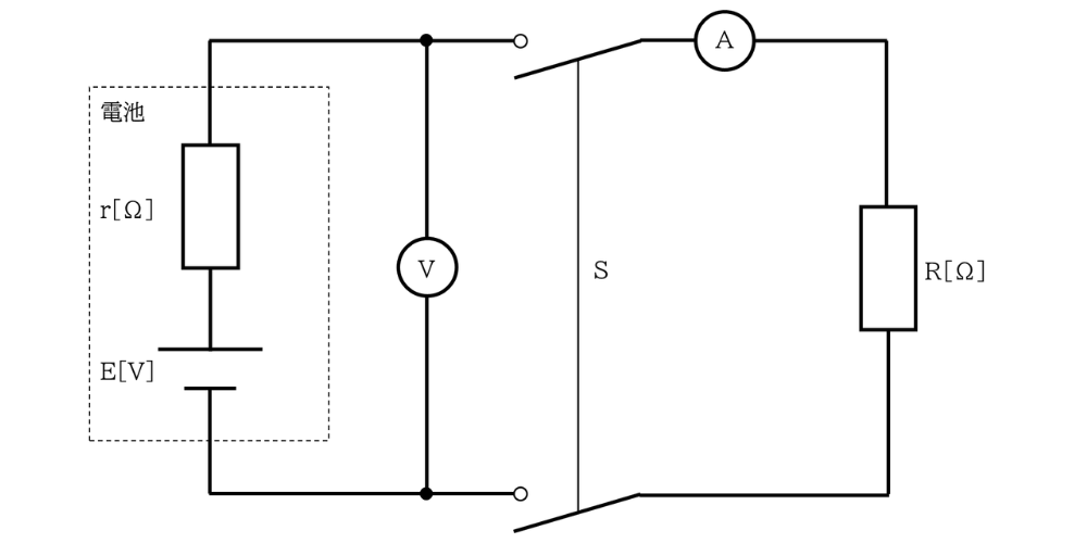 スイッチSが開かれた状態(開放状態、または無負時)にあるとき、電圧計に表示される端子電圧V[V]は電池の両端の電圧E[V]と等しくなる。